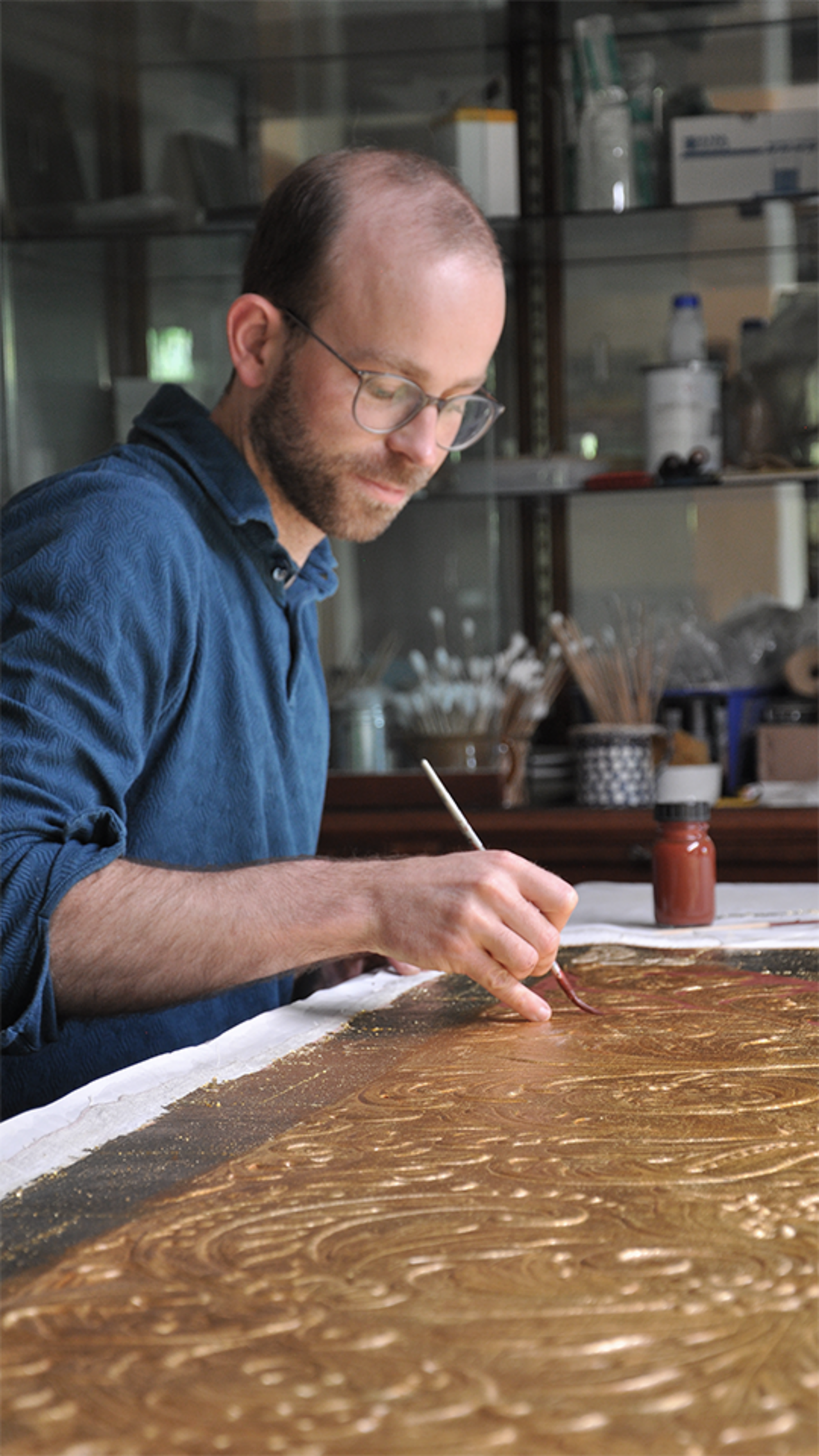 Franz Rewoldt, Jahrgang 1994, lebt in Dresden und studiert im 4. Studienjahr Konservierung und Restaurierung von Kunst- und Kulturgut. Der angehende Restaurator und Kunsttechnologe sammelte umfassende praktische Erfahrungen in verschiedenen Praktika und seiner freiberuflichen Tätigkeiten, darunter die Konservierung und Restaurierung von historischem Papierstuck und handgedruckten Papiertapeten. Franz Rewoldt engagiert sich zudem in der berufspolitischen Interessensgruppe RiA (Restaurator*innen in Ausbildung) und war von 2021 bis 2023 deren stellvertretender Sprecher.