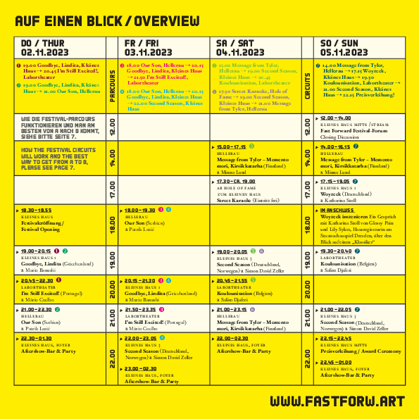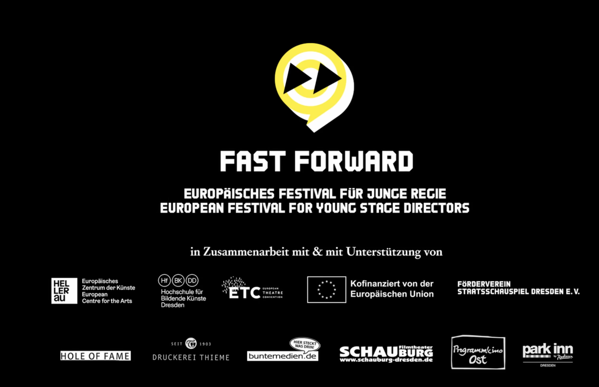 Fast Forward is a European theatre festival for young stage directors. Over four days annually in November, the festival presents productions from all over Europe by artists who are still at the beginning of their careers as directors. Our aim is to show how diverse contemporary young theatre is, to provide the next European generation a platform and to offer the audience surprising new theatre. An international jury awards one of the productions invited a festival prize, the winner of which is invited to create a new production at the Staatsschauspiel Dresden. Furthermore, there is a young jury and an audience award.