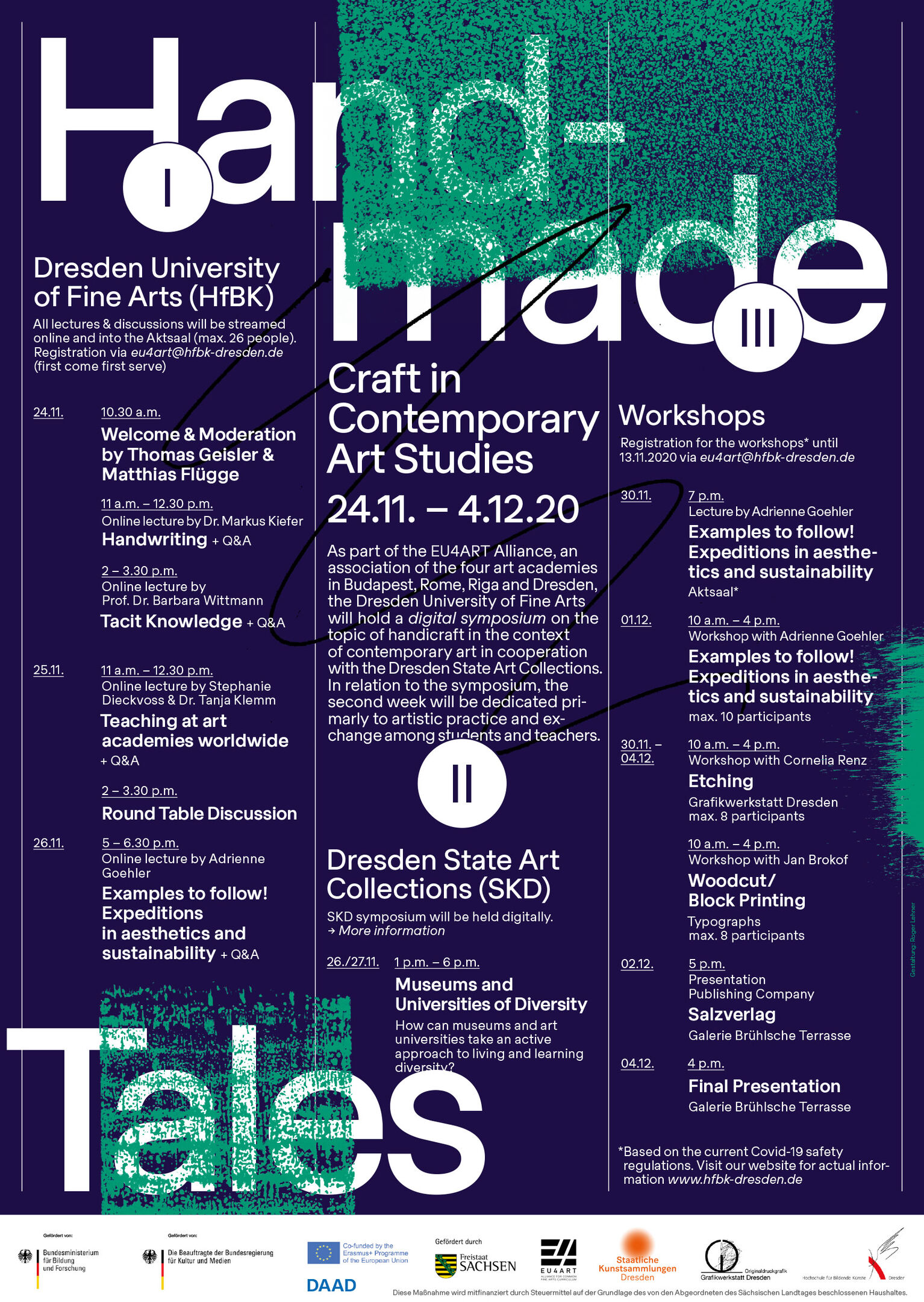The first week of the symposium will be dedicated to a series of digital lectures. Experts from various disciplines with unique perspectives will shed light on the potential of craft practices in the context of contemporary art and artistic teaching at universities. Central theoretical questions will also be debated, as well as the role of material, craft processes and their significance for students' artistic development. The online lectures will be streamed.