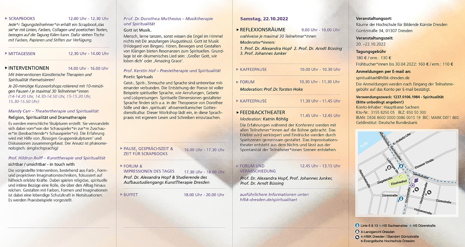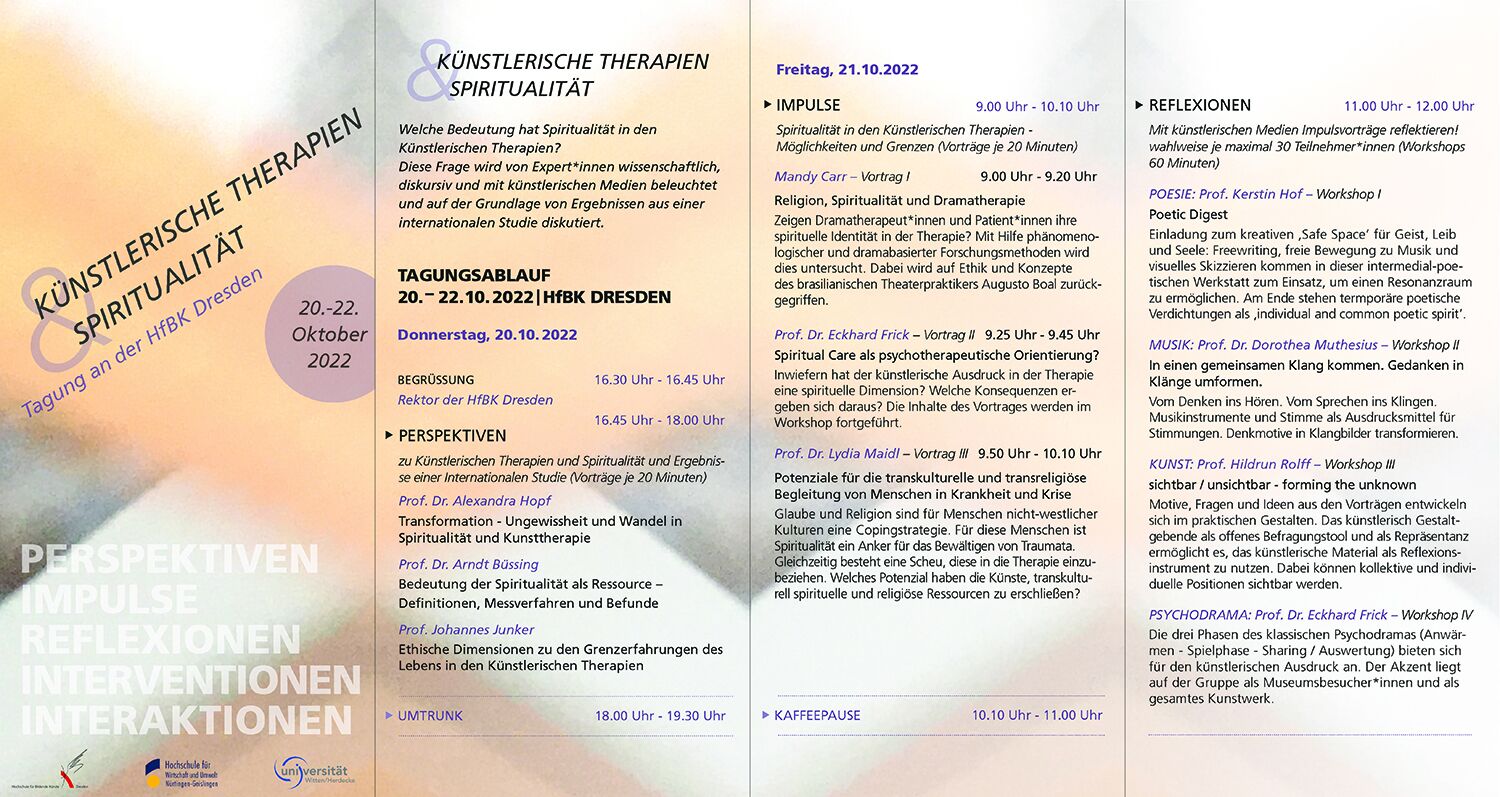Ergebnisse einer internationalen Studie im Berufsfeld der Künstlerischen Therapien (Intermediale Kunsttherapie, Expressive Arts Therapy, Kunsttherapie, Theatertherapie, Musiktherapie, Tanztherapie, Poesietherapie, u. a.) werden mit Expert*innen diskutiert. Der wissenschaftliche Diskurs zu Künstlerischen Therapien und Spiritualität zielt darauf ab, Eingang in künstlerisch-therapeutische Hochschulcurricula zu finden und Konzepte für die Anwendungspraxis zu entwickeln.