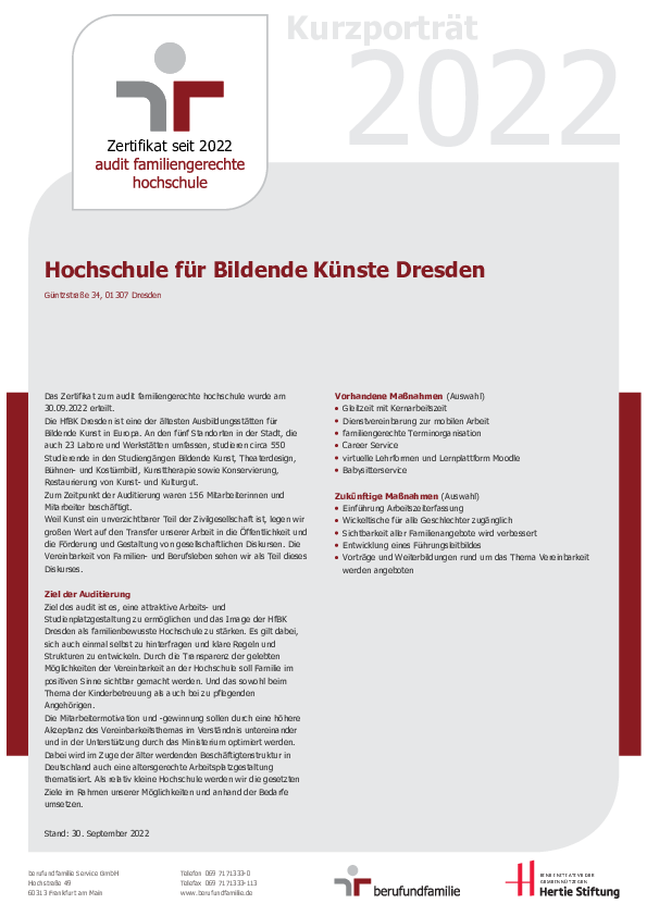 Das Zertifikat zum audit familiengerechte hochschule wurde am 30.09.2022 erteilt. Die HfBK Dresden ist eine der ältesten Ausbildungsstätten für Bildende Kunst in Europa. An den fünf Standorten in der Stadt, die auch 23 Labore und Werkstätten umfassen, studieren circa 550 Studierende in den Studiengängen Bildende Kunst, Theaterdesign, Bühnen- und Kostümbild, Kunsttherapie sowie Konservierung, Restaurierung von Kunst- und Kulturgut. Zum Zeitpunkt der Auditierung waren 156 Mitarbeiterinnen und Mitarbeiter beschäftigt.