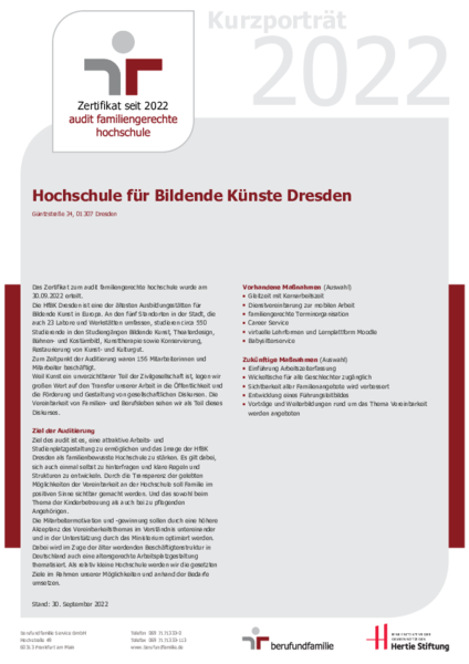 Die Hochschule für Bildende Künste Dresden möchte neben ihrer fachlichen Exzellenz familiengerechte Rahmenbedingungen für Studierende und Beschäftigte etablieren und für alle Angehörige der Hochschule ein attraktiver Studienort und Arbeitsplatz sein.