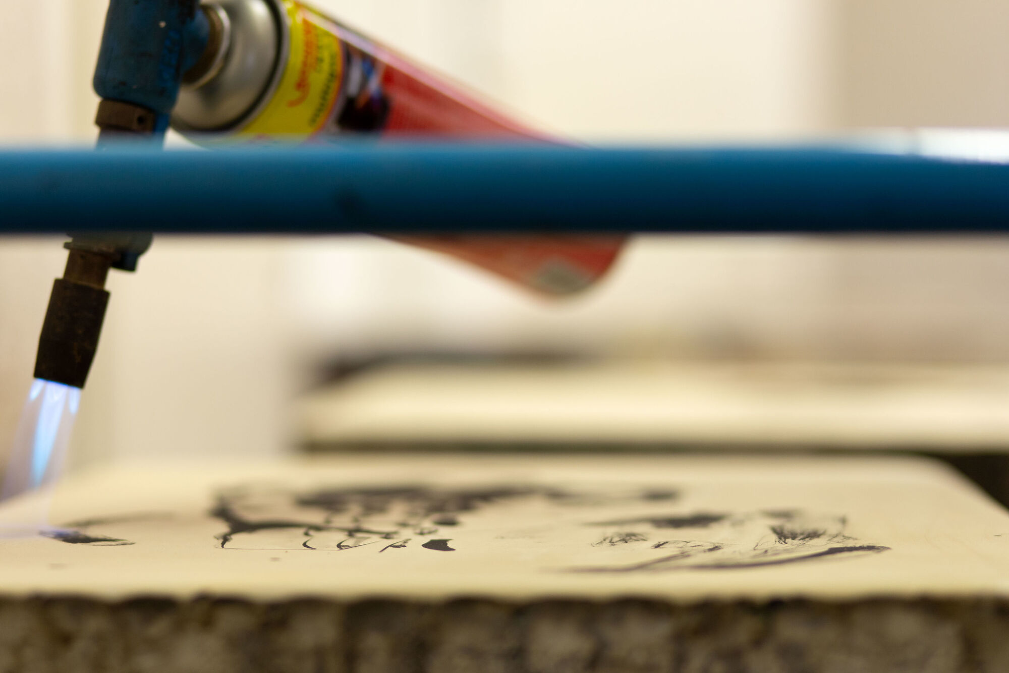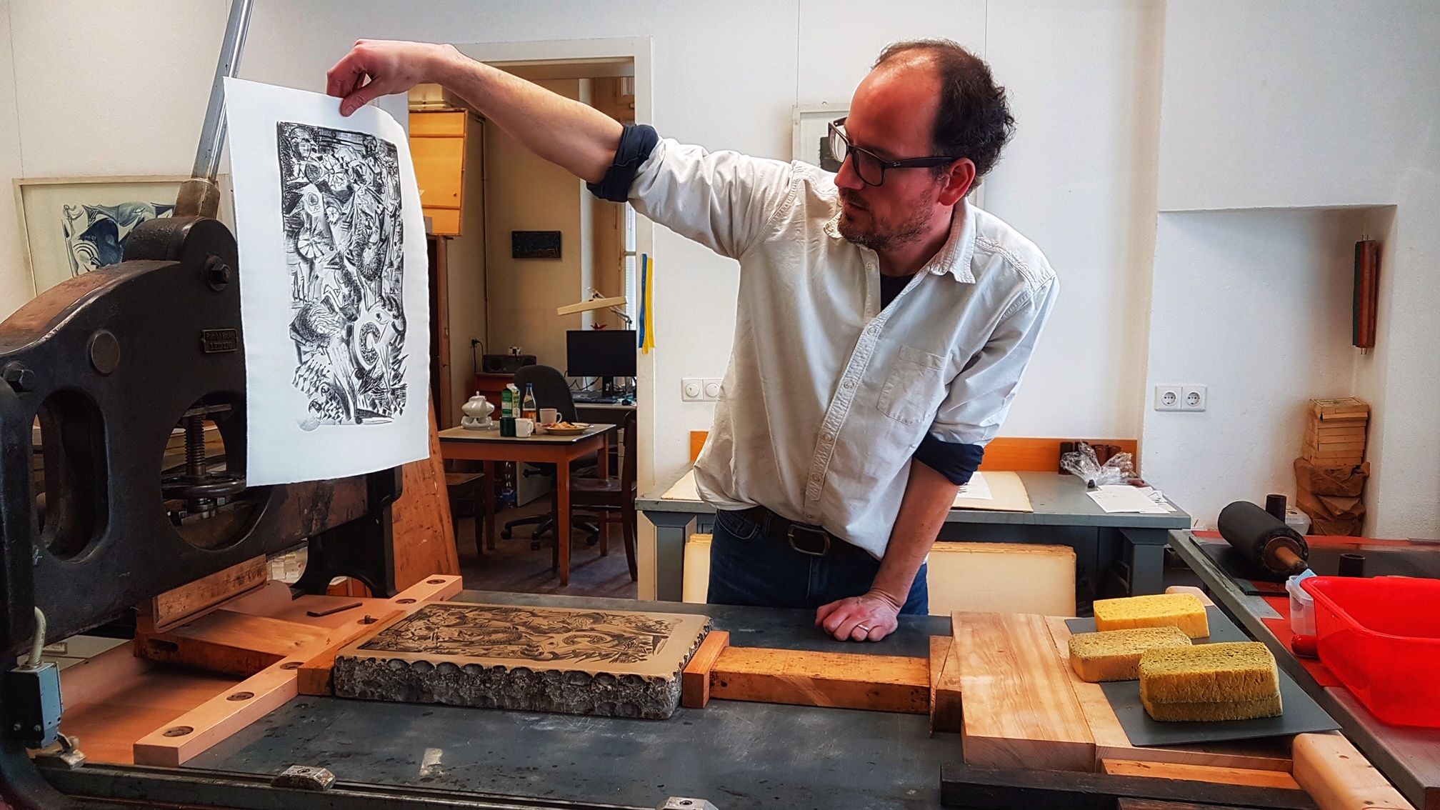 In der Werkstatt für Lithografie und künstlerischen Steindruck werden die technisch-handwerklichen Vorgänge vermittelt, die die Grundlagen für das Ausschöpfen der Möglichkeiten dieser grafischen Technik sind.