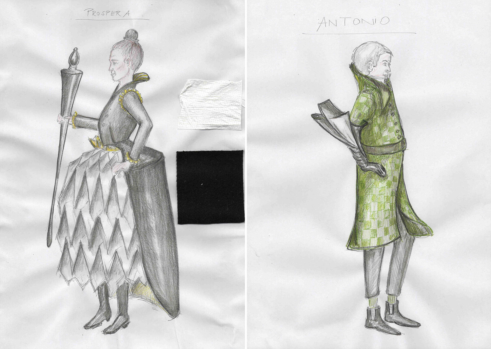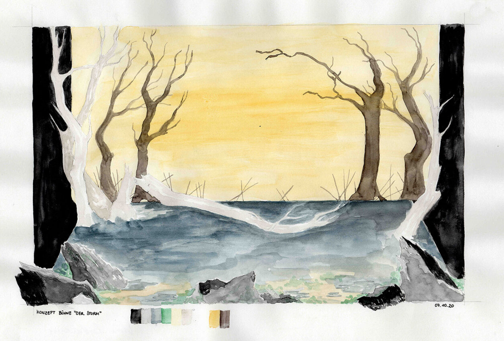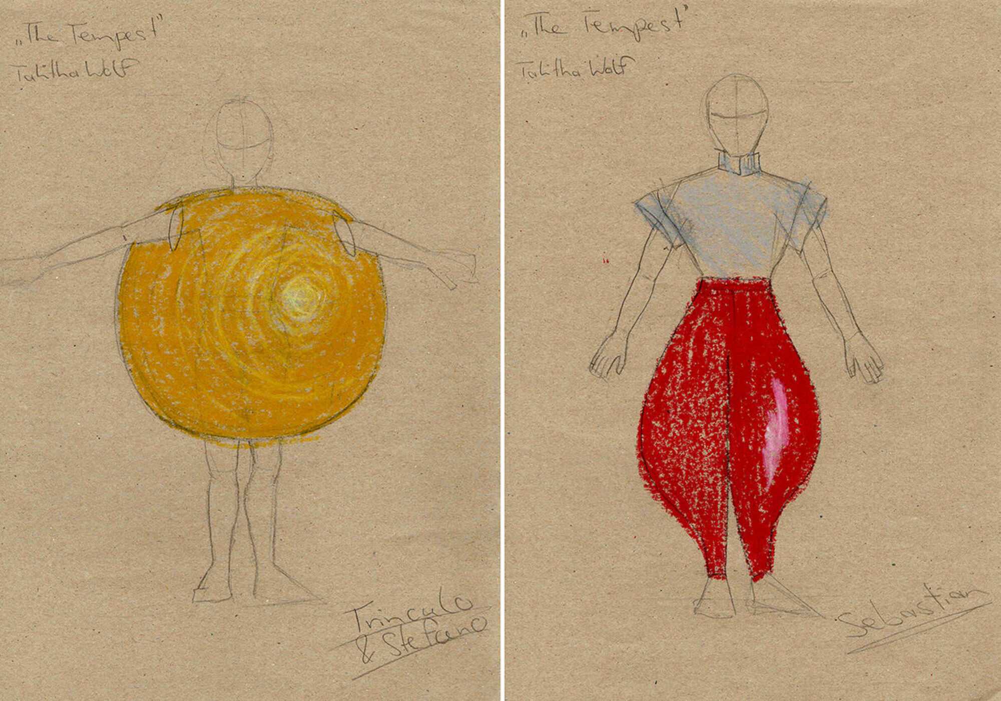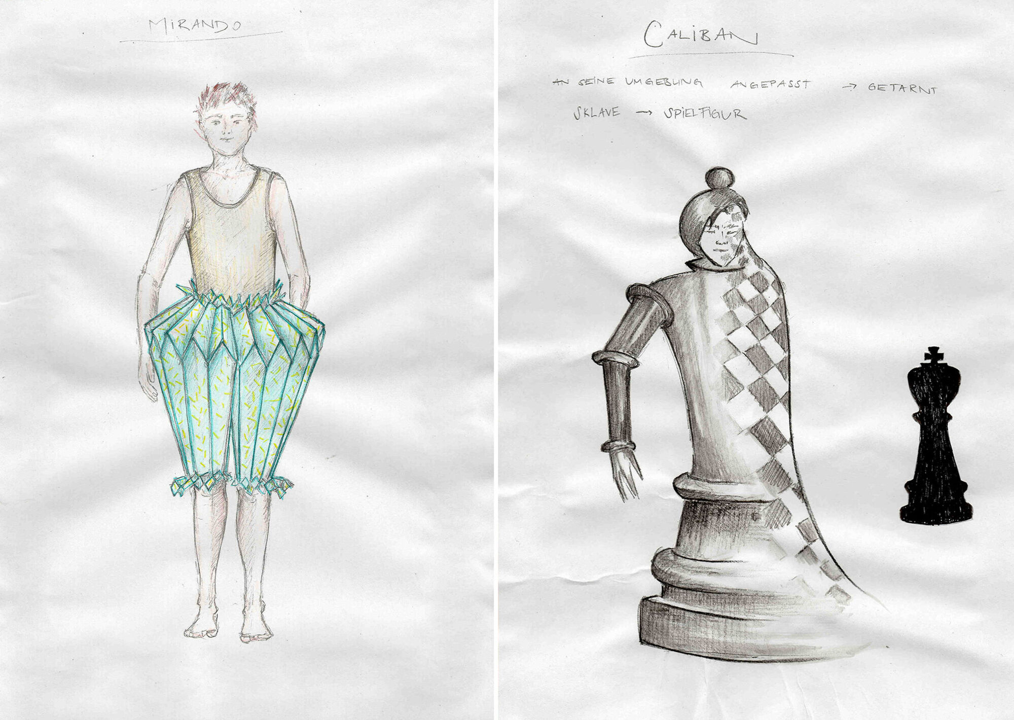 Die im Folgenden gezeigten Arbeiten entwarfen Studierende des 4. Studienjahres zu Shakespeares "Der Sturm".