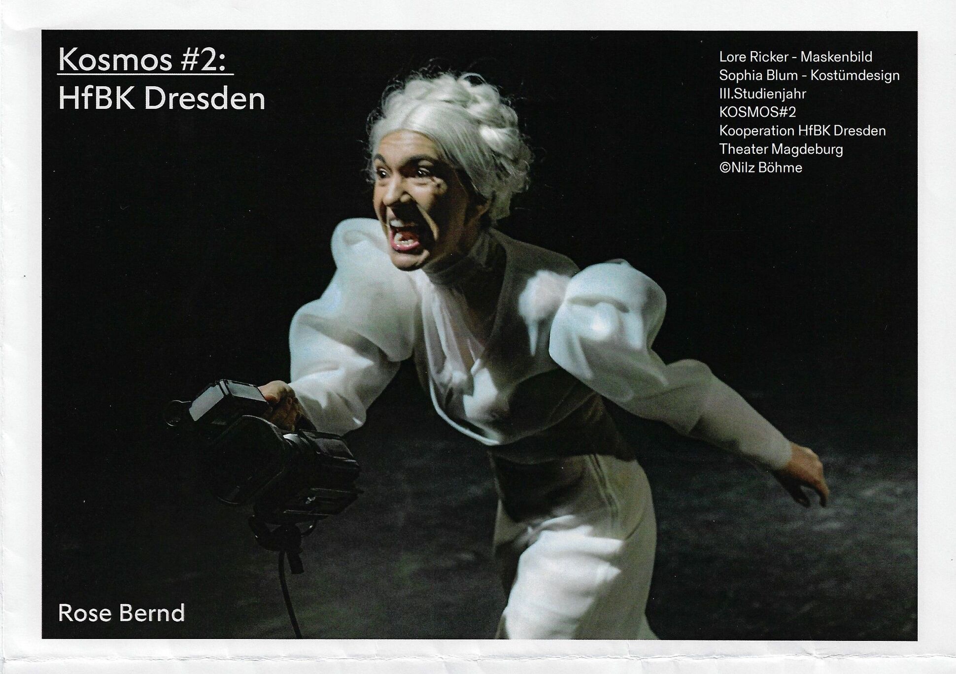 Die Reihe Kosmos gibt es am Theater Magdeburg seit der Spielzeit 2022/23. Dieses Format erprobt neue Formen der Zusammenarbeit. Diesmal liegt der Fokus auf Berufseinsteiger:innen. Studierende der Hochschule für Bildende Künste Dresden haben sich, künstlerisch begleitet von Kostümbildner Clemens Leander, in Teams mit jeweils einer Figur der Theaterliteratur beschäftigt. Ihre Entwürfe für Kostüm- und Maskenbild wurden in Zusammenarbeit mit den hiesigen Theaterwerkstätten umgesetzt.