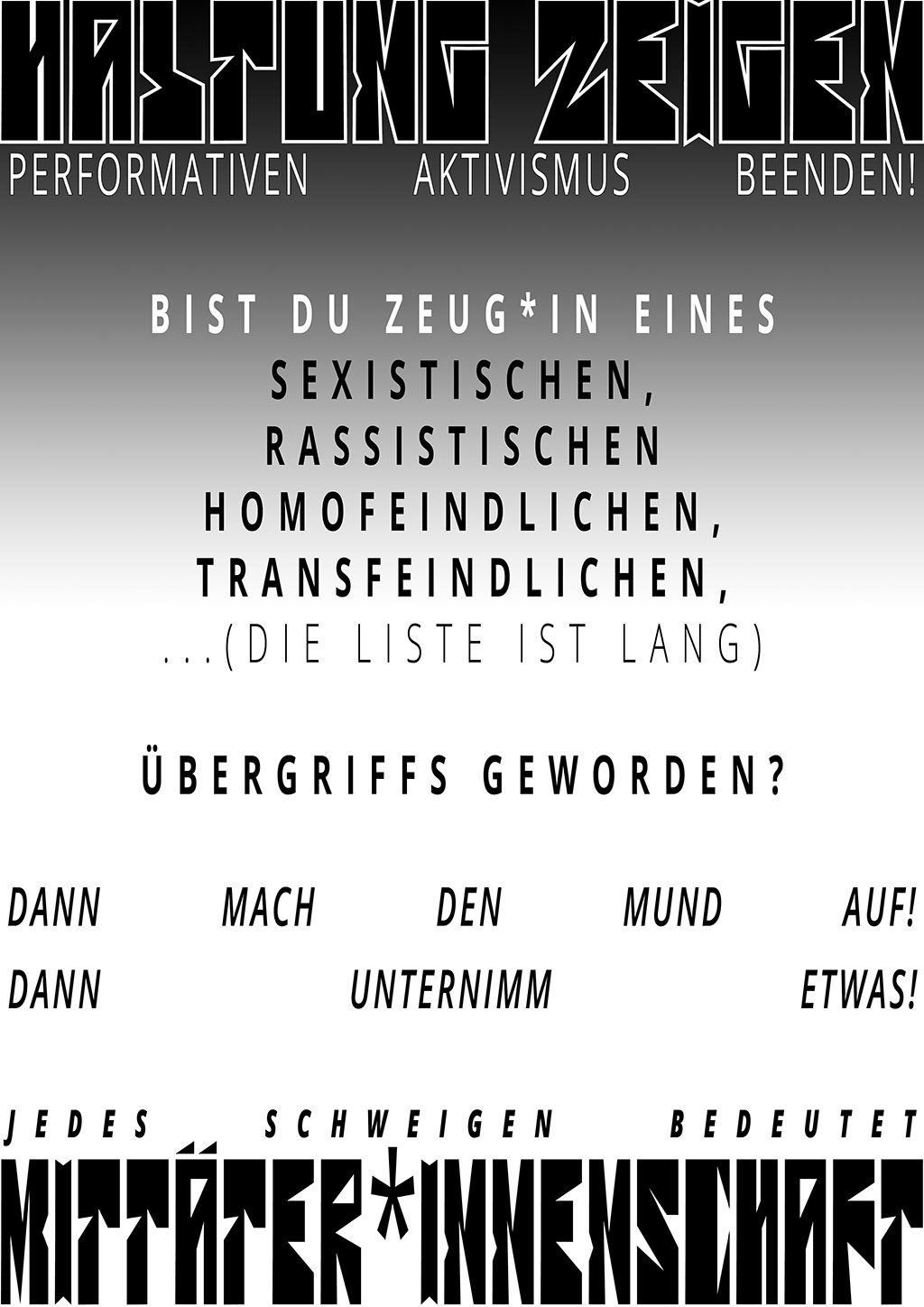 You would want to work concering the topics of racism, sexism, trans- and homophobia and ableism in the context of our academy? You are looking for a politically active group in which you can set own priorities? You want to know more about the inner politics of the academy and have an impact in decisions concerning us as students? Write us an e-mail to: gleichstellung-stura@hfbk-dresden.de!
