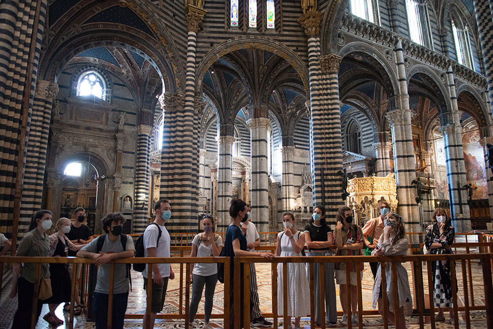 Der Workshop begann mit dem Besuch des Doms von Siena, der den Gästen die Möglichkeit bot, die vielfältigen künstlerischen Aspekte des Monuments zu entdecken, wobei der Schwerpunkt auf dem spektakulären eingelegten Marmormosaikboden lag.
