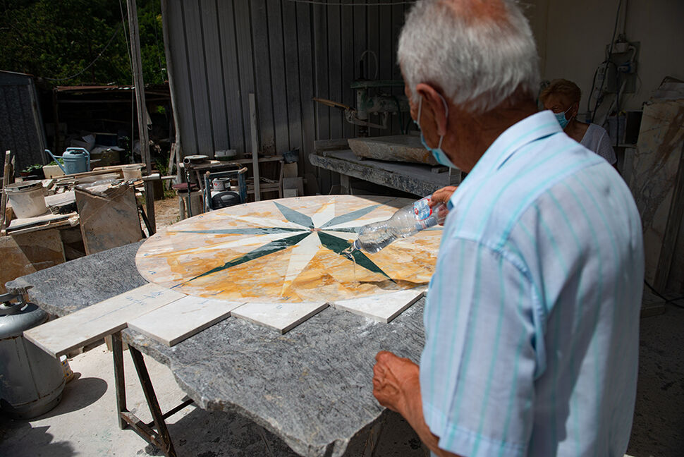 In der Hügellandschaft der Montagnola Senese führte Professor Fusi durch das Marmorlabor der Gebrüder Galardi, wo die Teilnehmer nicht nur die traditionelle Marmorverarbeitung, sondern auch die besonderen Eigenschaften des Gelben Marmors von Siena kennenlernten.