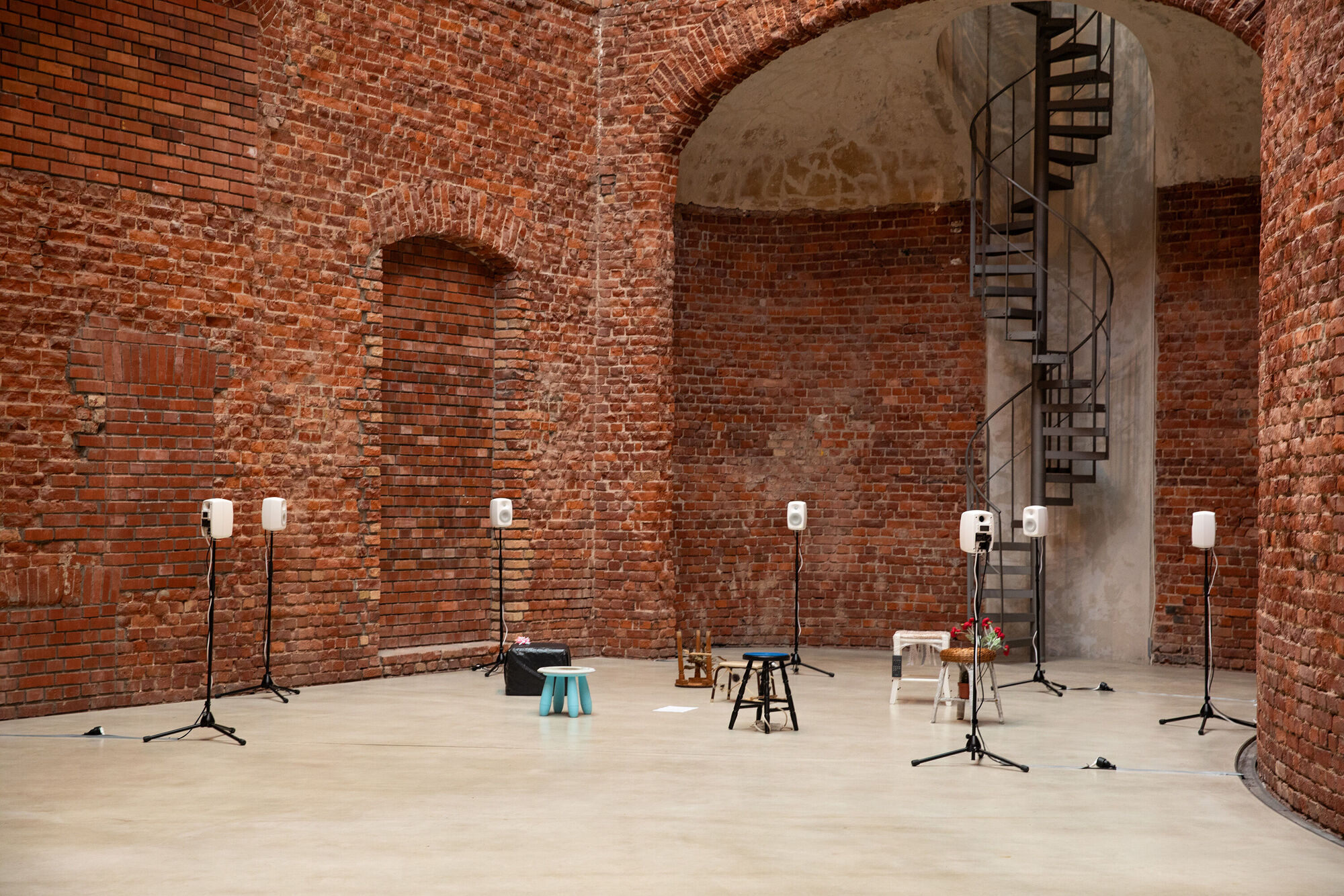 Eine labyrinthische Rauminstallation widmet sich der Arbeitswelt von Bauarbeitern. Zwischen zwei gegenüber liegenden Fenstern morsen Scheinwerfer Liebesbriefe. Eine Malmaschine hinterfragt die Autorschaft.