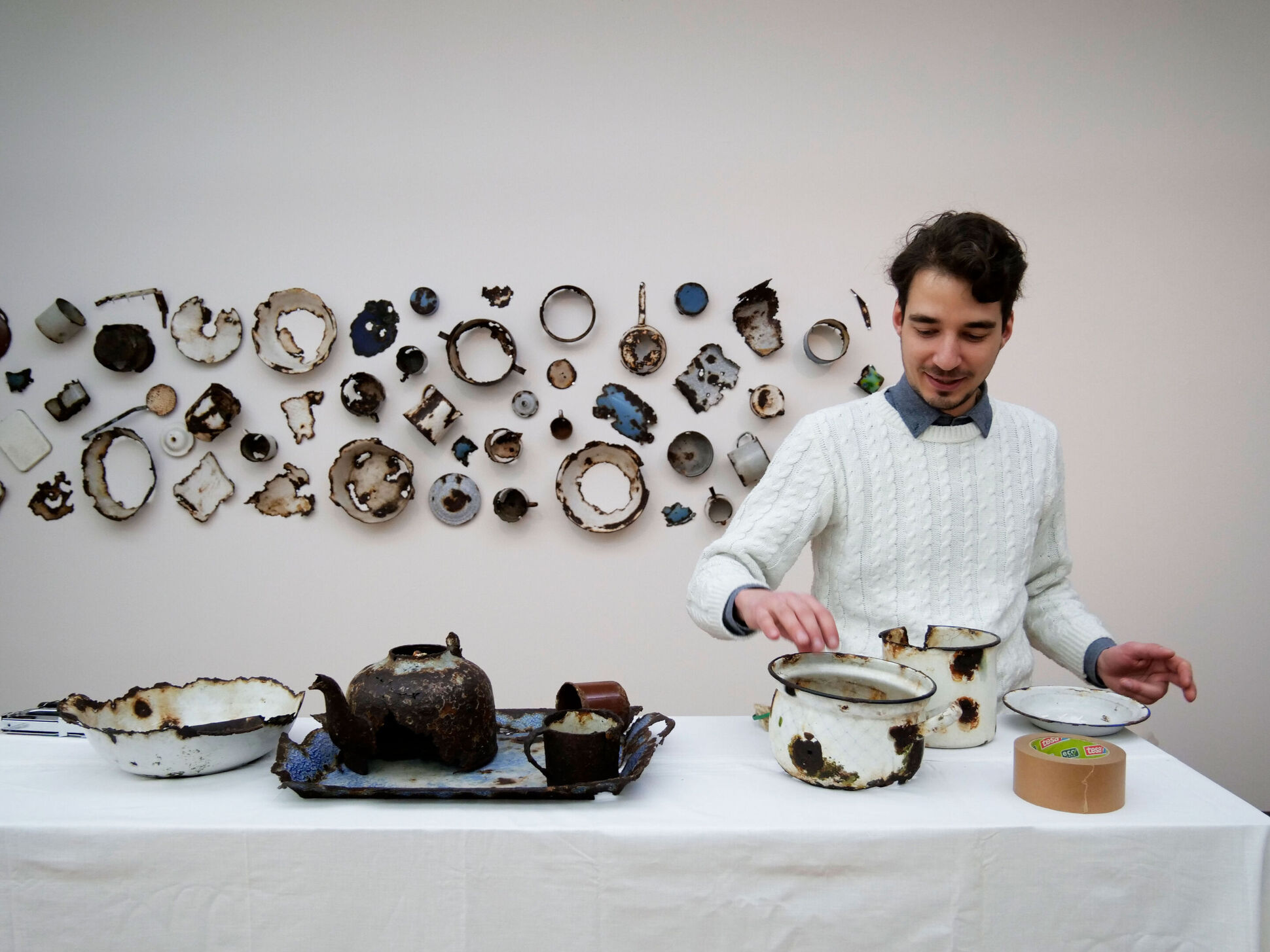 Gleb Konkin-von Serebrowski (geb. 1997 in Sankt Petersburg) arbeitet mit verschiedenen Medien. Im Zentrum seiner Kunst stehen Installationen aus objets trouvés – historische Fundstücke, die er mit selbst geschaffenen Elementen verbindet, um persönliche und kollektive Traumata sichtbar zu machen.