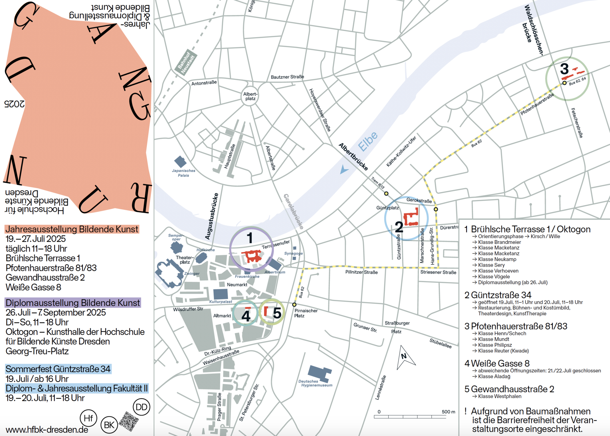 Die Hochschule für Bildende Künste Dresden öffnet ab 18. Juli 2025 die Türen an allen Standorten und lädt zu den Höhepunkten des Semesters ein: den Jahres- und Diplomausstellungen im Rahmen des Rundgangs 2025. Um 19 Uhr wird die Jahresausstellung der Fakultät I (Bildende Kunst) auf der Pfotenhauerstraße mit der Verleihung des DAAD Preises für ausländischen Studierende und der Bekanntgabe der Stibet-Förderungen eröffnet.