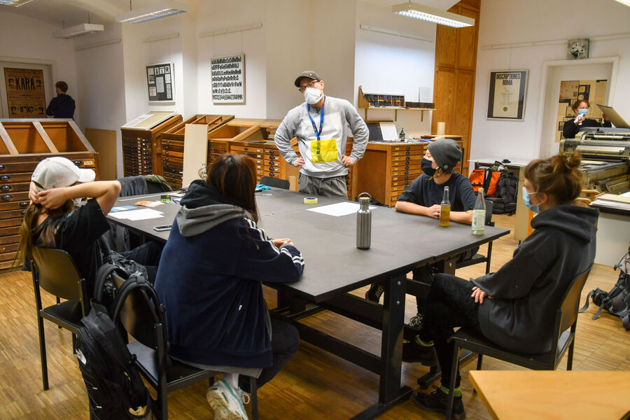 Die zweite Woche widmete sich dem analogen „Kunstmachen“. Leider konnten Studierende der Partnerakademien, an den Workshops von Cornelia Renz zur Radierung, von Jan Brokof zu Blockdruck und Holzschnitt und von Adrienne Goehler zu Kunst und Nachhaltigkeit, aufgrund von Corona, nicht teilnehmen. Den Studierenden der HfBK Dresden hingegen eröffneten sich in dieser Workshop-Woche vielerlei Perspektiven zum Umgang mit Material und Techniken. Besonders die Arbeit in der Grafikwerkstatt Dresden, ebenfalls ein assoziierter Partner von EU4ART, war dabei eine einzigartige und tolle Möglichkeit in die Radierung einzutauchen. In ihrem Workshop zum Thema Nachhaltigkeit gab Adrienne Goehler viele neue Denkanstöße, die bereits bei der Wertschöpfung des Materials beginnen. Auch hier war die Kamera ein stetiger Begleiter, wodurch die Workshopwoche digital festgehalten und im Sinne der Nachhaltigkeit dokumentiert wurde.