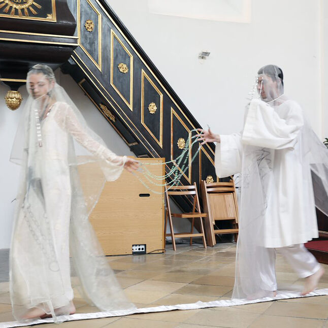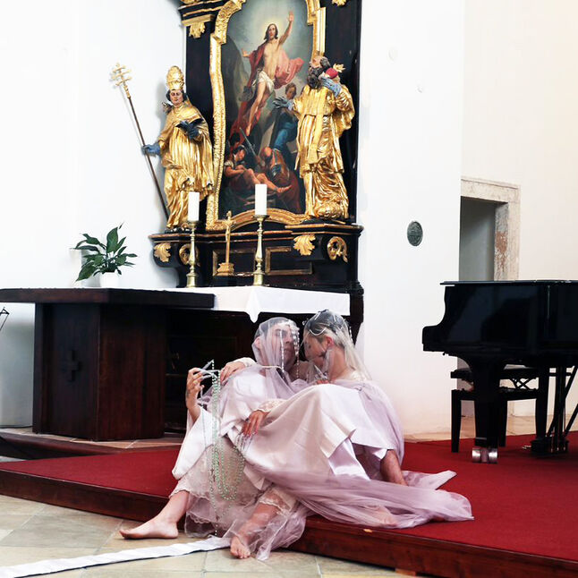 Die Kapelle der Abtei, mit ihren sakralen Funktionen bildeten den Rahmen für die gemeinschaftliche Arbeit: Ausgehend von der Kapelle und der zu ihr führenden Treppe nahmen die Studierenden zum Anlass einen temporären "Kalvarienberg" zu schaffen. Die Studiengruppe verband die verschiedenen Stationen des Kreuzweges mit Spiegeln, die sich an den Rückspiegeln des Organisten orientierten, der dadurch die Gottesdienste verfolgen kann. Neben den Spiegeln schufen die Teilnehmenden durch die mitgebrachten persönlichen Erinnerungsstücke eine Verbindung zwischen den einzelnen Stationen des Kreuzweges und verwiesen gleichzeitig auf den Aufruf des Erinnern 2021, das Motto des Kulturprogrammes von Pannonhalma.
